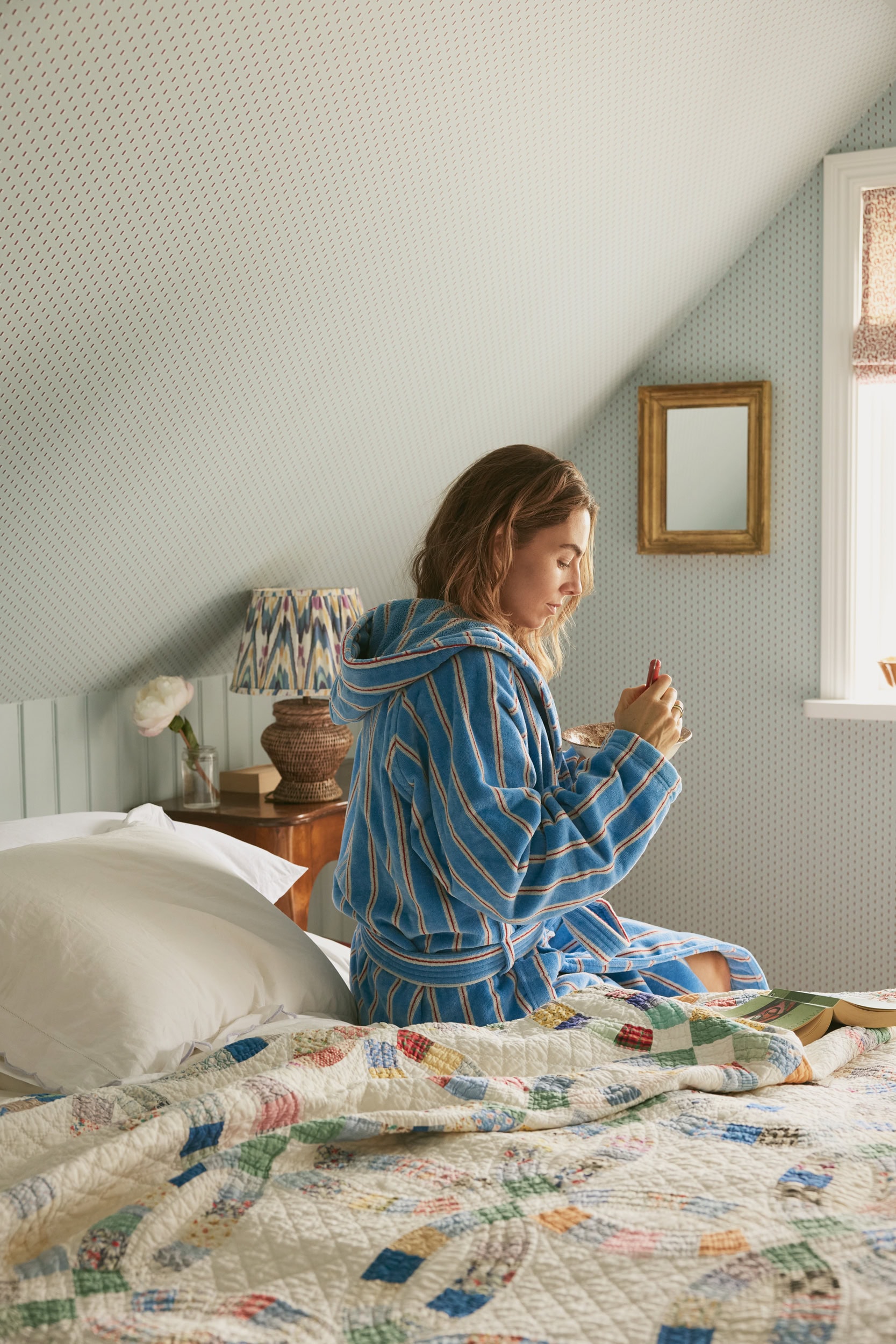 Musterliebe trifft auf Handwerkskunst in einer einzigartigen Zusammenarbeit, bei der Cathy Nordströms zeitlose Muster auf das textile Erbe von Pelle Vävare treffen. Das Ergebnis ist darauf ausgelegt, sowohl in Gefühl als auch in Funktion über die Zeit hinweg zu bestehen. Aus dieser Kooperation ist der Morgenmantel Stig entstanden. Als leidenschaftliche Sammlerin schwedischer Vintage-Keramik hat Cathy die gestreiften Gefäße des bekannten schwedischen Designers Stig Lindberg schon immer geliebt. Eine seiner ikonischen gestreiften Schalen diente als Inspiration für dieses klassische Streifenmuster, das jedem Raum eine raffinierte Verspieltheit verleiht.